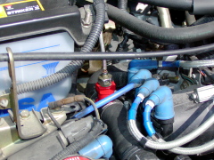 左の写真が装着状態。フィーリングでは初期ロールがかなり抑えられました。ただしステアリングを切り込んでいくとノーマルタイヤの変形が負けてしまいます。でも7800円以上のチューニング価値はありますね。次はタイヤをグレードアップしなければ。
