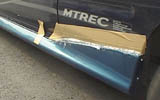 MTT9を目前にして、ボンネットの中央に大きなキズをつけられてしまいました。あわてて板金修理に出したのですが、ただ修理して元通りにするので は物足りない病が発症。以前、興味ついでに三菱iを雨の日に試乗したことがあってそのときにワイパーからウォッシャー液が出ることを思い出しました。そこ で補修ついでに純正ウォッシャーノズルを廃止してスムージング。そして三菱iのワイパー一体ウォッシャーノズルを装着しました。【2006.10.08】