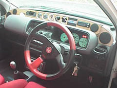 両サイドに二つ並ぶのがスピーカー。ツイーターとスコーカーの組み合わせを贅沢に並べました。そしてセンターには大森の追加メーターが5連。バキューム、油温、油圧、水温、排気温度の予定。追加メーターの右隣には1/2DINサイズが3つ積み重ねられるようにレイアウト。でも今はデジタルスピードメーターだけ。その隣は以前つけた室内、室外温度計。純正のデジタル時計はグローブボックス上に配置。以上が追加メーターに並べるデバイスです。配線の取り回しをセンターの時計の穴から行う予定でしたが、以外と狭いので新規に二つダッシュボード上に大穴を開けました。これで配線も楽々。【2001.08.04】