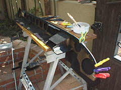 大小のスピーカーの間には段差があり、ここはウレタンフォームを充填してなめらかに整形。そしていよいよ合皮の張り付けに取りかかります。下地として黒色に塗装し、木工用ボンドを水で薄めてはけをつかってパネル上に接着剤を塗ります。そして合皮を載せて張り込みます。縁はしわがよらないように切り込みを入れてクランプすればOK。【2001.09.24】