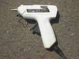 最近のグルーガン(ホットメルトは商品名らしい)はタレ防止のため、先端に樹脂のガイドが付いているものがほとんどです。サイズは大小2種類と思っていたんですが、スティックの径に微妙な差があって使えない物があることがわかりました。現在わたしが使っているガンの内径はφ7mm。市販のものには7.0mm、7.2mm等があります。7.2mmは微妙に入りませんでした。