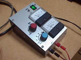 写真の上側の赤いつまみは無段階の電圧調整。下側の青いつまみは3,6,9,12Vのセレクターつき。電圧計と電流計を装備。