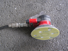 レンタルガレージJUNTOHRUにて利用させてもらったエアサンダーです。ペーパー部分はマジックテープになっているので、必要な番目のペーパーに交換することが可能。先端部は偏心した円を描くように振動します。パテ盛り部を平らに成型するのはあっという間にできます。これがあれば板金修理も早いものです。