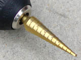 これはあると便利。薄板の金属板に10mm以上の穴をあけるのってけっこう大変なんですよね。小さい穴をあけて徐々に大きなドリルの歯に替えて何度も繰り返す。これを一本でやってのけるのがこのステップドリルです。写真のとおり階段状にドリルの歯が大きくなっています。3mm程度の鉄板をいとも簡単に10mm以上の穴があけられます。ホームセンターで入手可能です。