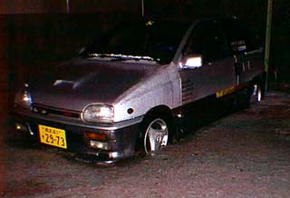 CARBOYで紹介された後、調子にのりすぎて大失敗。筑波山での予期せぬアクシデント。自損だったから良かったのものの、車の姿は右の写真のとおりでした。リーザの愛着が捨てきれない私は修理の見積もりを出してもらいました。答えは90万円也。一瞬でリーザ2台目を探すことを決心しました。【1992.12.16】