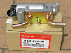 結局洗浄では完全には戻りませんでした。結論はEACVの故障。新品を入手し(右の写真)、交換したら正規のアイドル回転に戻りました。しばらく経つとちゃんとアイドル設定回転に戻るので故障ではないと思ってましたが、本来すぐに設定回転に戻るはずなのでやはり故障してたということですね。【2004.08.21】