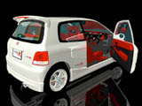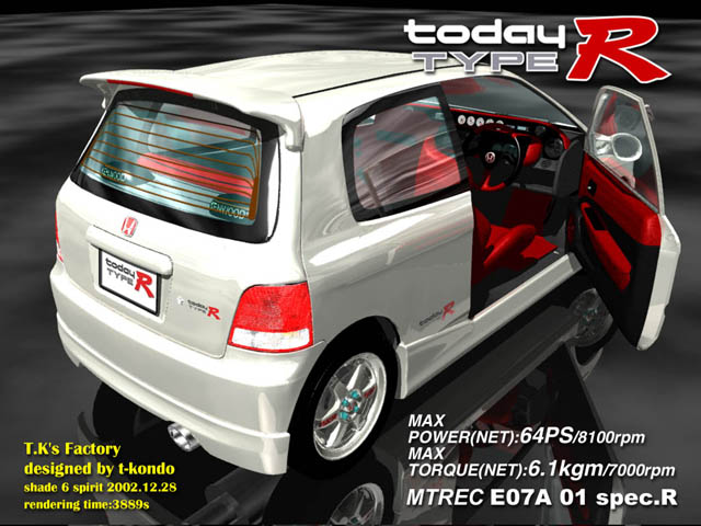 ドアやタイヤには回転軸を設定すると自由に位置を変更することができます。そこでドアを開いた状態をレンダリング。リヤトレーにはKENWOODのスピーカーを設置。追加メータ、タイプRメータ共に画像をステッカーマッピング。この画像じゃ見えませんので、ギャラリーの画像へどうぞ。【2002.12.23】