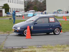 午後からの第3ヒートはようやく路面が乾きはじめた状態です。ほとんどのドライバーがタイムアップしてきました。写真はゼッケン22番のしったかたーさんのミラ(スラローム後の折り返し地点)とゼッケン120番の鈴木さんのchacha(最終コーナー)。