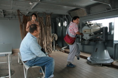 戦艦みかさ内部。機銃を操作しているのは、まーねこさん。かなり重そうです。他にもいろいろな展示があって、楽しませてくれます。船内の端には、戦略会議室が。といっても現在は映画館。著名な俳優の若き演技が出てくる映画でした。丹波哲郎さんとか、ガッツ石松さんとか。