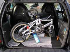 当初リーザとトゥデイに載ればいいかなと思ってましたが、なんとスマートにも搭載できましたので報告します。ハンドルの根本から折れるようにたたむ構造です。運転席側の後にちょうど、小径フロントタイヤがすっぽりはいるので、この角度以外では搭載できません。リーザ、トゥデイなら重ねれば2台入るかも。【2007.02.25】